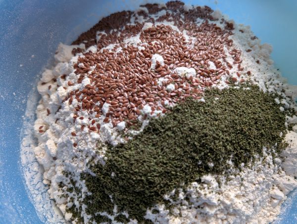 Heute ist Brotbacktag. In den Teig kommen jedes Mal ein paar andere Körner und Saaten. Heute sind es Leinsamen und Brennnesselsamen aus eigenem Anbau.