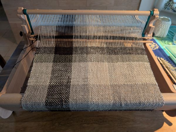 Hier entsteht ein Webstück aus selbstgesponnener und teilweise pflanzengefärter Wolle. Es soll ein Kissenbezug daraus werden.