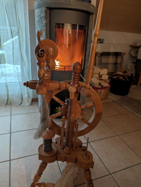 Ein wenig Zeit fürs Spinnrad nehme ich mir täglich. Es ist entspannend, vor allem vor dem gemütlichen Feuer. Außerdem verschlingt der Webrahmen unglaublich viel Garn, also muss dringend Nachschub her.