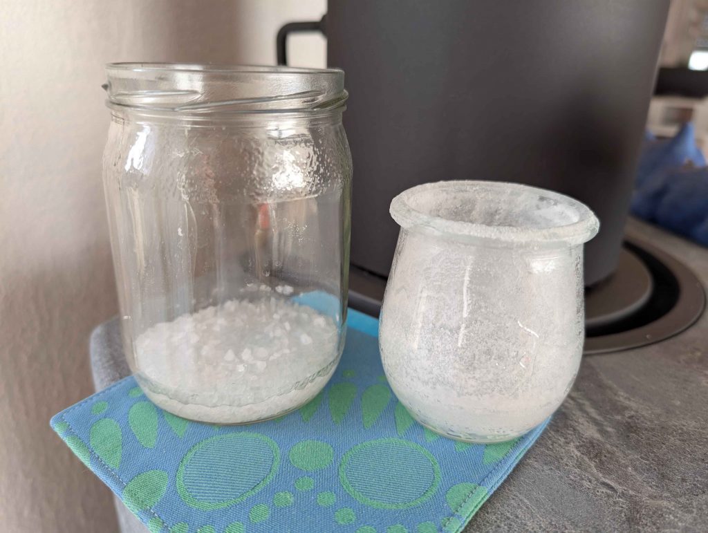 Auf dem Kaminofen „frosten“ seit ein paar Tagen zwei Gläser vor sich hin. Das erste ist fertig, das zweite habe ich erst gestern dazugestellt. Ich liebe den Effekt, der mit ein wenig Salz, Wasser und Wärme entsteht und für eine tolle Wintertischdeko sorgt.