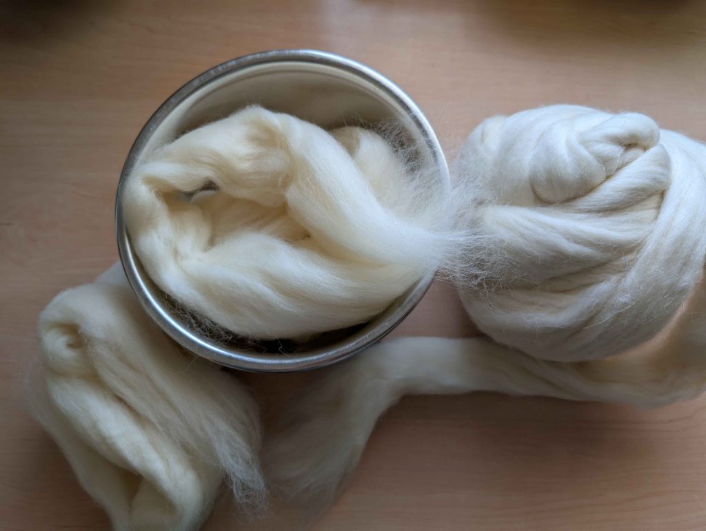 Wieder zu Hause schnappe ich mir eine große Kugel Merinokammzug und wiege zweimal 25g ab.