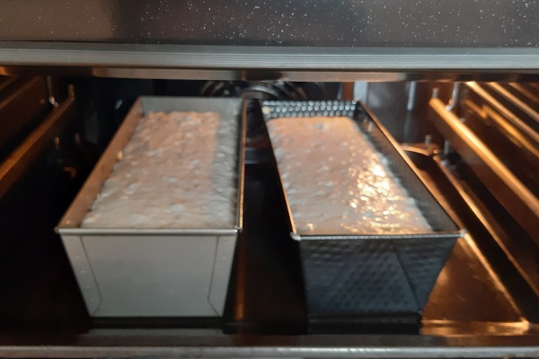 Der Teig ist inzwischen gut aufgegangen und kann jezt für eine Stunde in den Ofen.