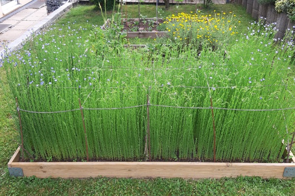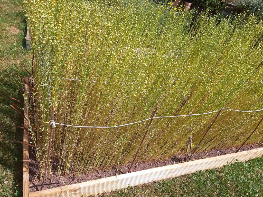 Als die Pflanzen etwa 50 Zentimeter erreichten, begann ich mir Sorgen um Wind und Regen zu machen. Mein Garten liegt recht offen, und Faserlein hat feine, empfindliche Stängel.