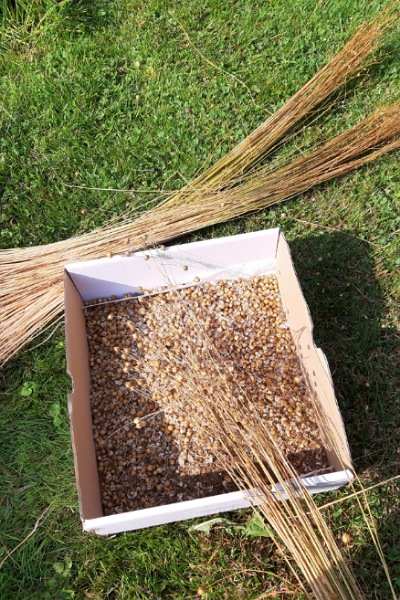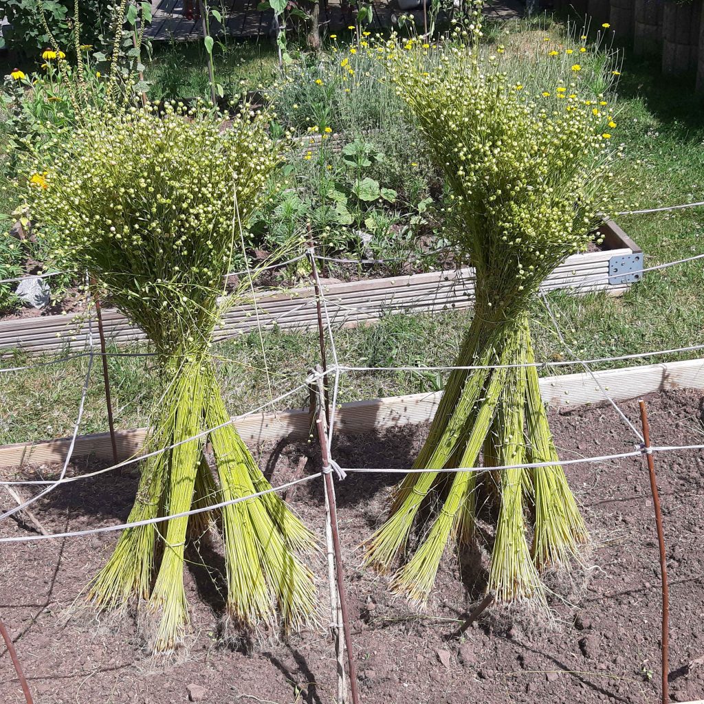 Obwohl die 100 Tage noch nicht ganz rum waren, habe ich mich entschieden, den Flachs zu ernten. Ich zog die Pflanzen mitsamt den Wurzeln aus dem Boden – das nennt man „raufen“ – und entfernte das wenige Unkraut dazwischen.