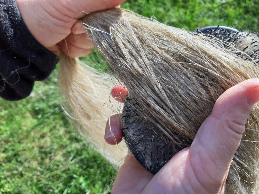 Für die Feinarbeit ersetzte ich die traditionelle Hechel kurzerhand durch eine alte Haarbürste. Immer wieder zog ich die Fasern hindurch, bis sie sich voneinander lösten, letzte Schäben abfielen und die kürzeren Fasern – das Werg – ausgekämmt waren.