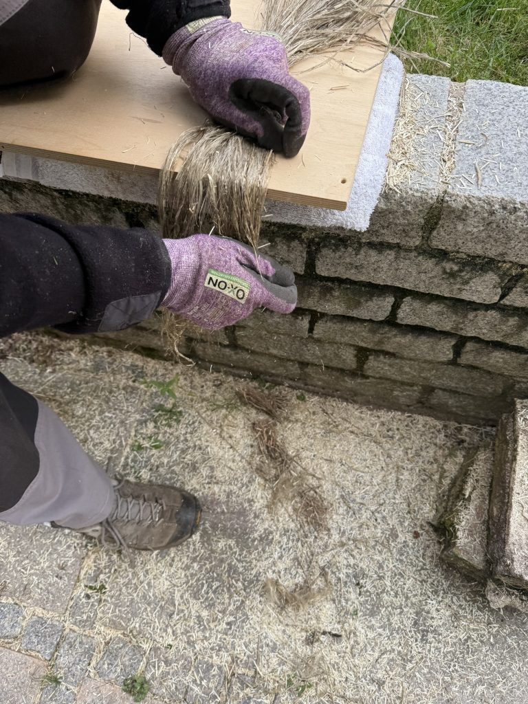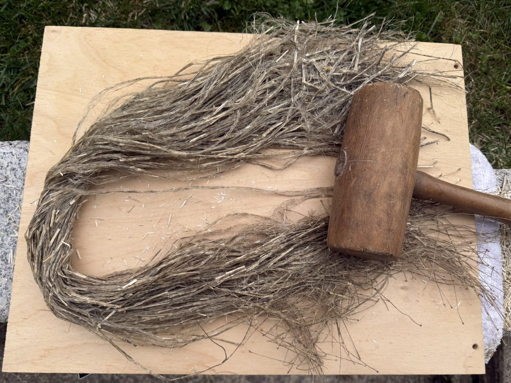 Ich nahm mir kleine Bündel vor und brach die Halme zunächst von Hand, um die Holzanteile zu lockern. Anschließend klopfte ich sie mit einem Holzhammer weich, Stück für Stück, bis sich der Faserverbund löste.