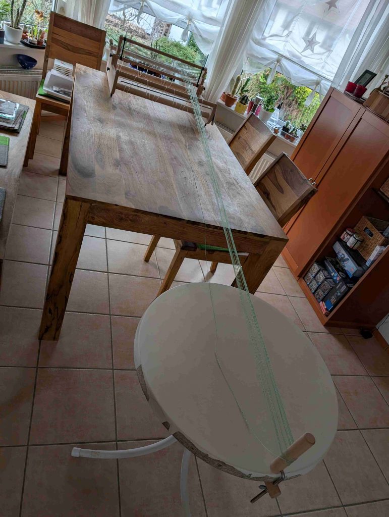 Der Aufbau zum Schären der Kette brauchte etwas Kreativität, denn eine Tischlänge von zweieinhalb Metern ist nicht gerade Standard. Nachdem dafür aber eine praktikable Lösung gefunden war, ging es eigentlich recht entspannt voran. Das viele Hin und Her im Raum hat meine Fitnessuhr jedenfalls sehr gefreut.