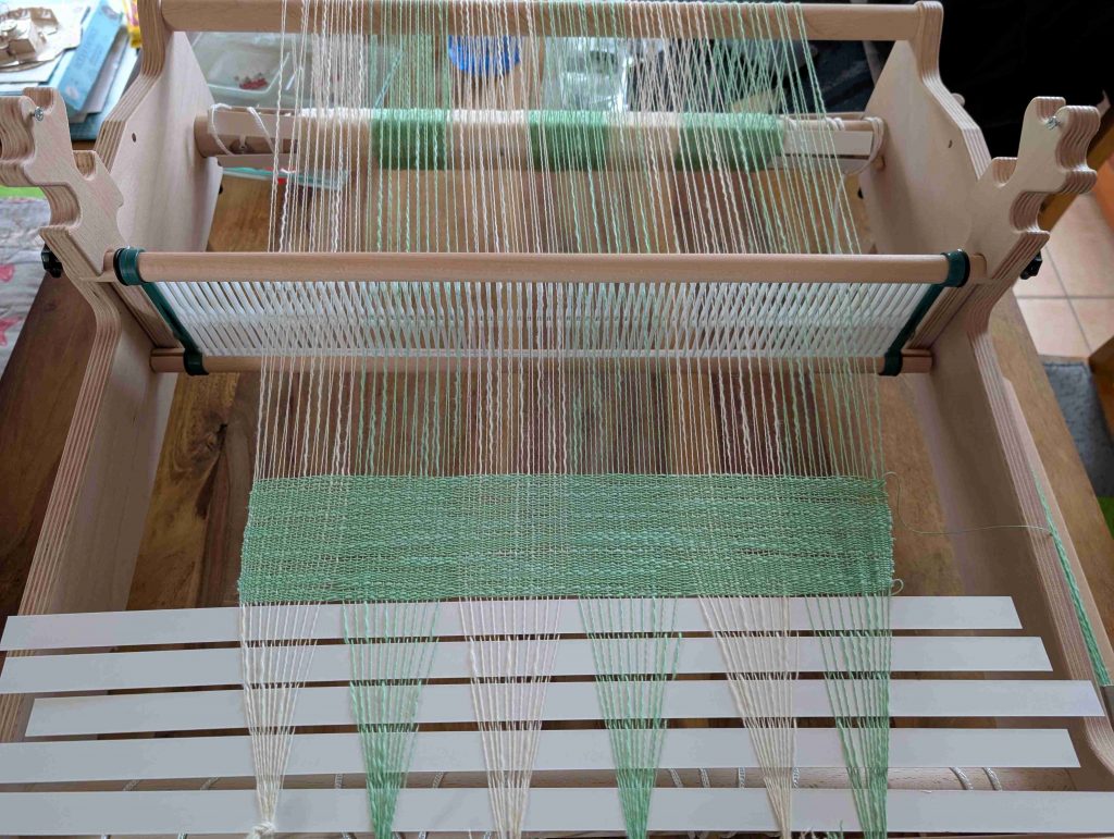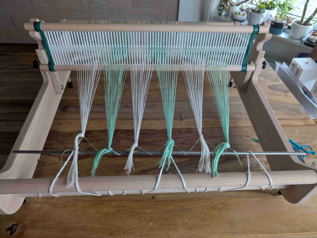 Mit den ersten Reihen habe ich mich dafür entschieden, im Stehen zu arbeiten. Auf dem Tisch war der Rahmen für mich schlicht zu hoch, und so wurde es eine ungeplante, aber durchaus angenehme Abwechslung in der Arbeitshaltung. Wie sich das langfristig lösen lässt, wird sich noch zeigen, fürs Erste hat es gut funktioniert.