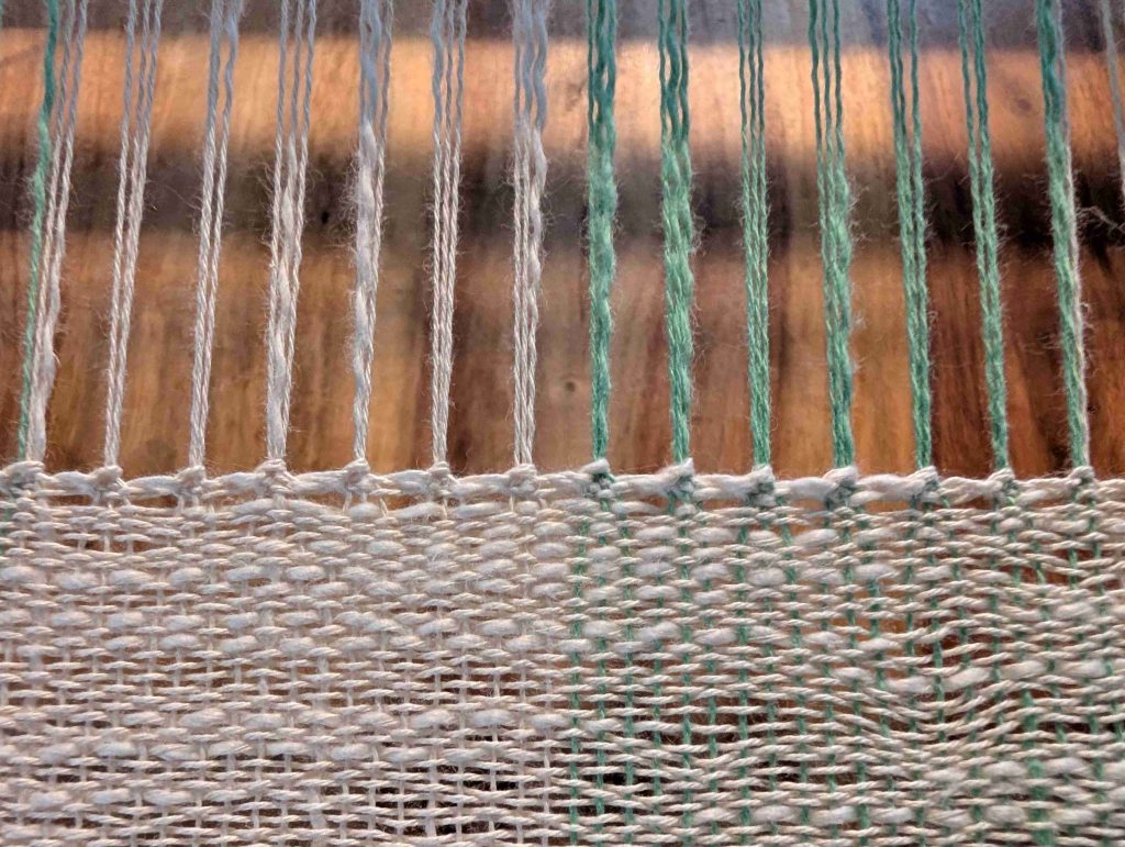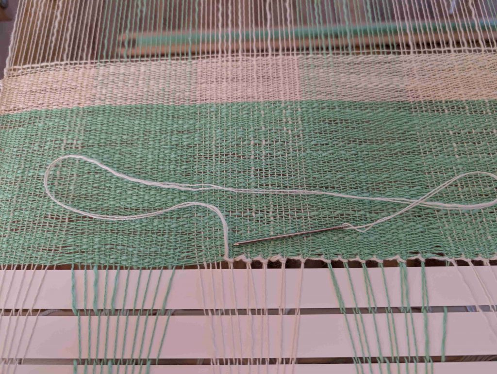 Rechtzeitig bevor der Anfang auf den Warenbaum aufgewickelt wird, mache ich einen Saumstich, um den Anfang zu sichern und die Fransen später einfach hängen lassen zu können.