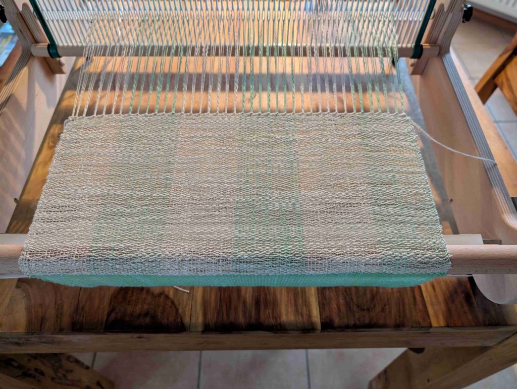 Das Weben selbst ging zügig voran. Natürlich noch ohne große Kontrolle über Gleichmäßigkeit oder Rhythmus, aber mit viel Freude am Prozess. Reihe für Reihe wurde das Gewebe länger, und das Gefühl für Material und Bewegung stellte sich langsam ein.