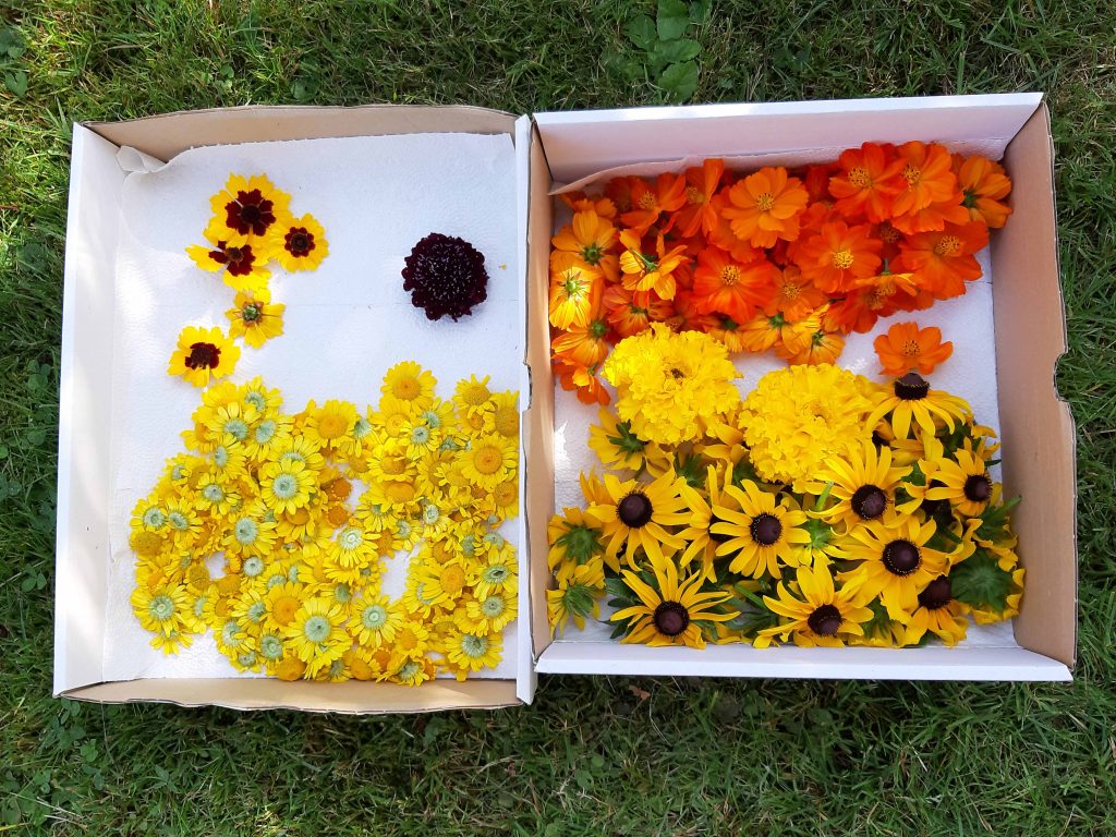Drinnen breite ich die geernteten Blüten vorsichtig in flachen Schachteln aus, die ich zuvor mit Küchenpapier ausgelegt habe. Jede Blüte bekommt dabei genügend Platz, sodass sie nicht aufeinanderliegt und rundherum gut trocknen kann. In meiner Werkstatt unter dem Dach, wo es warm, luftig und schattig ist, trocknen die Blüten in wenigen Tagen vollständig durch.