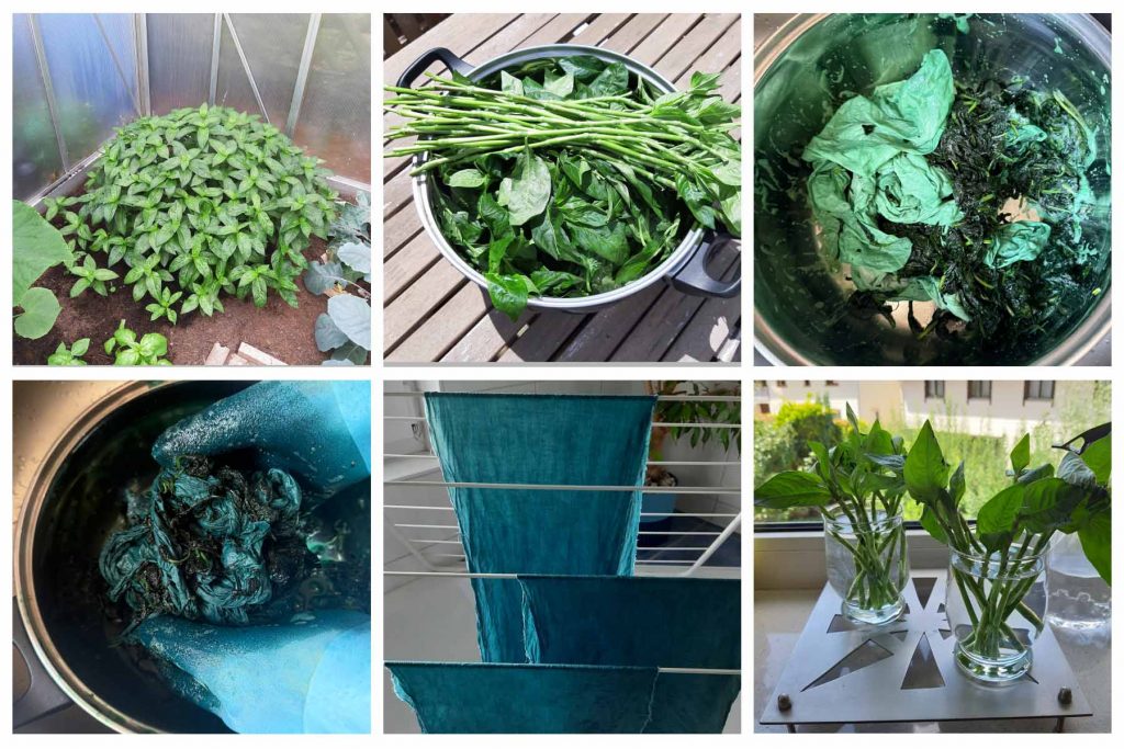 Sobald die gewünschte Farbintensität erreicht ist, wird der Stoff gründlich ausgewaschen, die Pflanzenteile sorgfältig entfernt und das Werkstück luftig zum Trocknen aufgehängt.