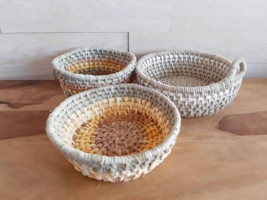 Hier siehst du einige Körbchen, die bislang entstanden sind. Diese sind ab sofort im Shop erhältlich, und wer ein bestimmtes Design, eine individuelle Größe oder eine spezielle Farbe wünscht, kann mich gerne direkt kontaktieren. Ich fertige die Körbchen auf Anfrage auch nach persönlichen Vorstellungen an.