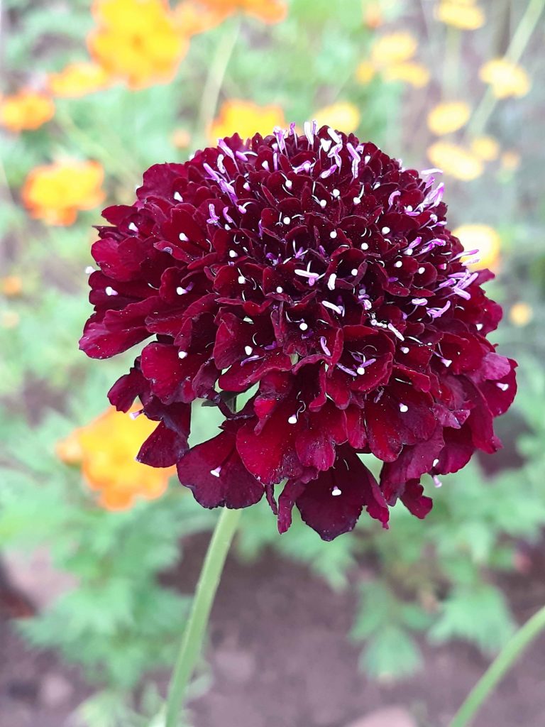 Auch von Mädchenauge, Schwefelkosmee und Tagetes gibt es derzeit täglich Blüten zu ernten. Ein besonderer Höhepunkt sind die ersten Blüten der Schwarzen Skabiose. Sie haben eine außergewöhnlich dunkle, satte Farbe und setzen besondere Akzente im Färberbeet. Ein echter Blickfang zwischen den anderen sommerlichen Tönen.