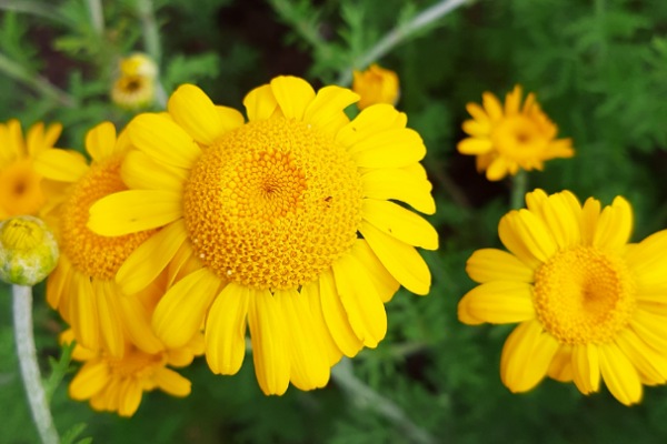 Die Färberkamille aus dem letzten Jahr hat sich kräftig entwickelt und steht inzwischen in voller Blüte. Ihre gelben Blütenkörbchen sind ein echter Blickfang und jetzt auch bereit für die erste Ernte.