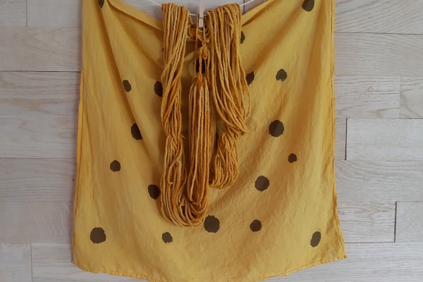 Der vorbereitete, bereits gebeizte Stoff und das Garn wurden vor dem Färben kurz in Wasser eingeweicht, damit sie die Farbe gleichmäßiger aufnehmen. Danach kamen sie in den noch warmen Sud und wurden darin erneut etwa eine halbe Stunde leicht geköchelt. Die Farbe zog schnell ein und brachte ein leuchtend warmes Gelb hervor. Nach dem Färben habe ich die Textilien gründlich mit Wasser ausgespült und zum Trocknen luftig und schattig aufgehängt. Erst im letzten Schritt, nach dem vollständigen Trocknen, wasche ich sie noch einmal mit einem milden, pH-neutralen Waschmittel aus.