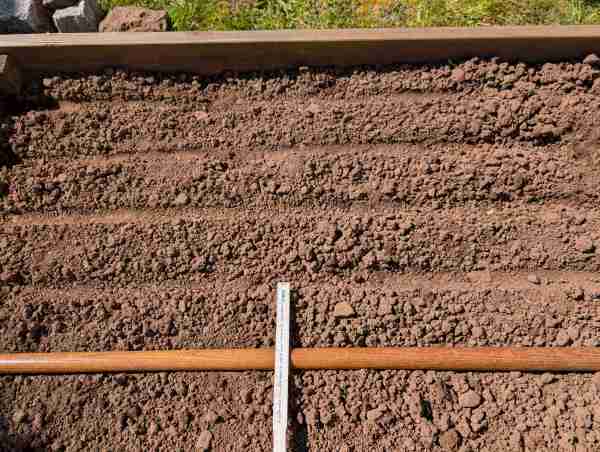 Nach der Vorbereitung habe ich die Reihen mit einem Zollstock abgemessen. Der Abstand liegt bei etwa 7 bis 8 cm.