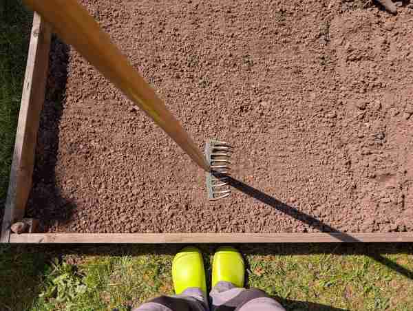 Anschließend wurde die Fläche mit dem Rechen leicht angedrückt. So entsteht ein guter Bodenschluss, der die Keimung unterstützt.
