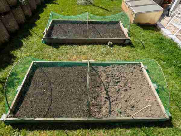 Zum Abschluss habe ich ein Netz über die Beete gespannt. In unserem Garten sind regelmäßig Katzen unterwegs, die frisch bearbeitete Erde gerne als Liege- oder Buddelplatz nutzen.