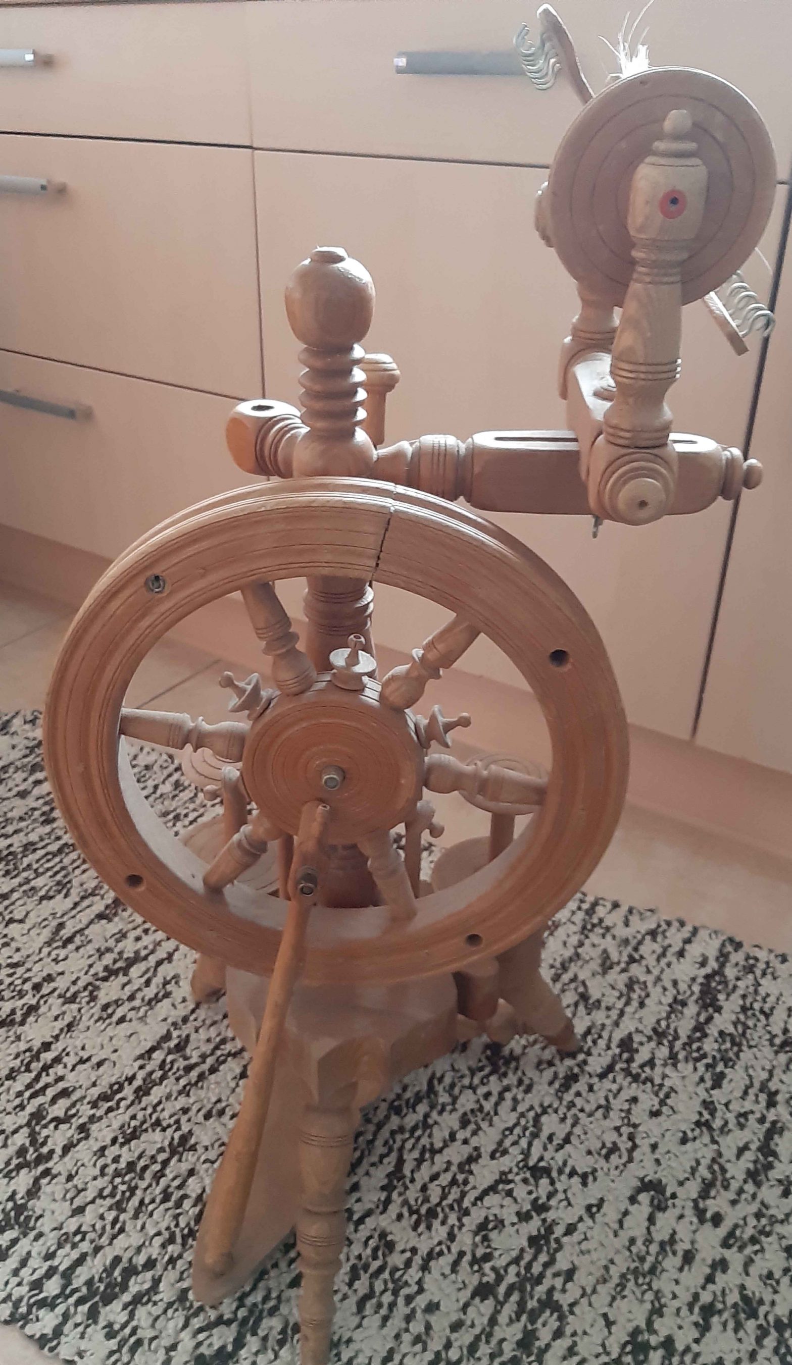 Nach den ersten Erfahrungen mit der Handspindel kam der nächste Schritt fast von selbst. Das Spinnrad. Ich hatte das Glück, ein älteres Modell geliehen zu bekommen. Solide gebaut, aber etwas in die Jahre gekommen. Bevor ich damit loslegen konnte, musste ich es erst einmal gründlich reinigen.