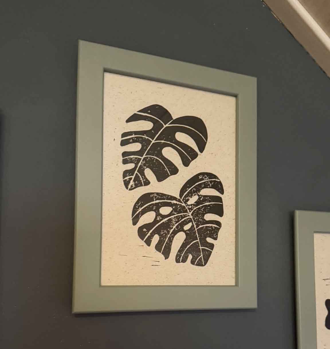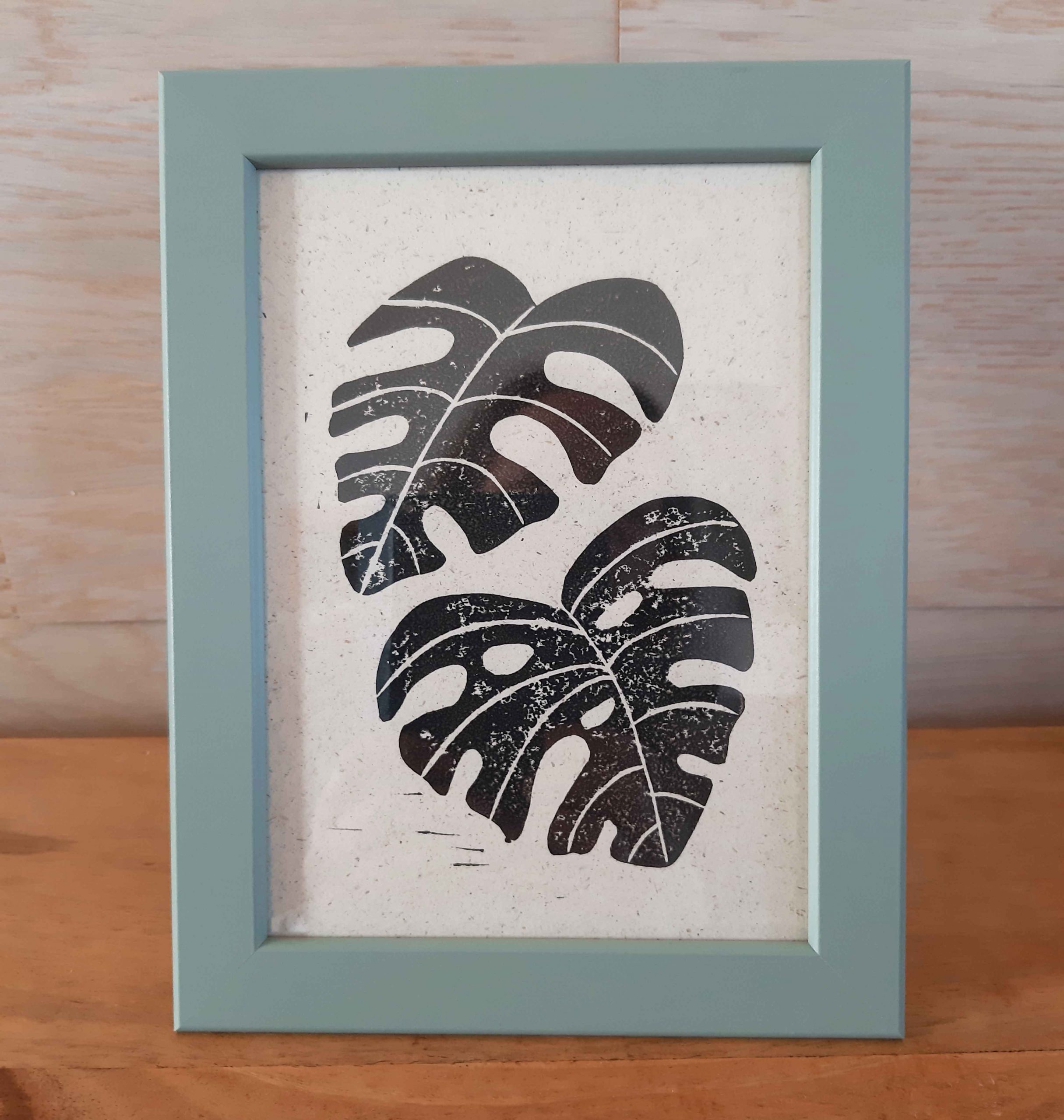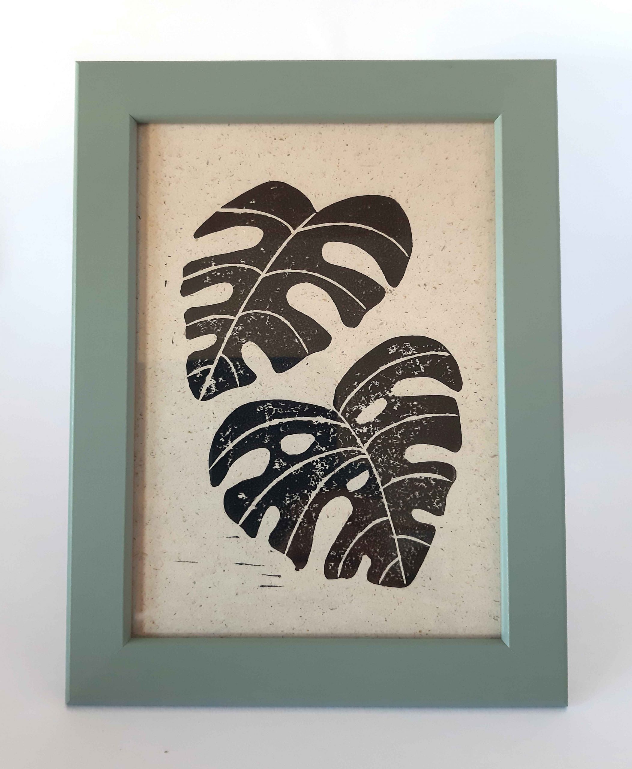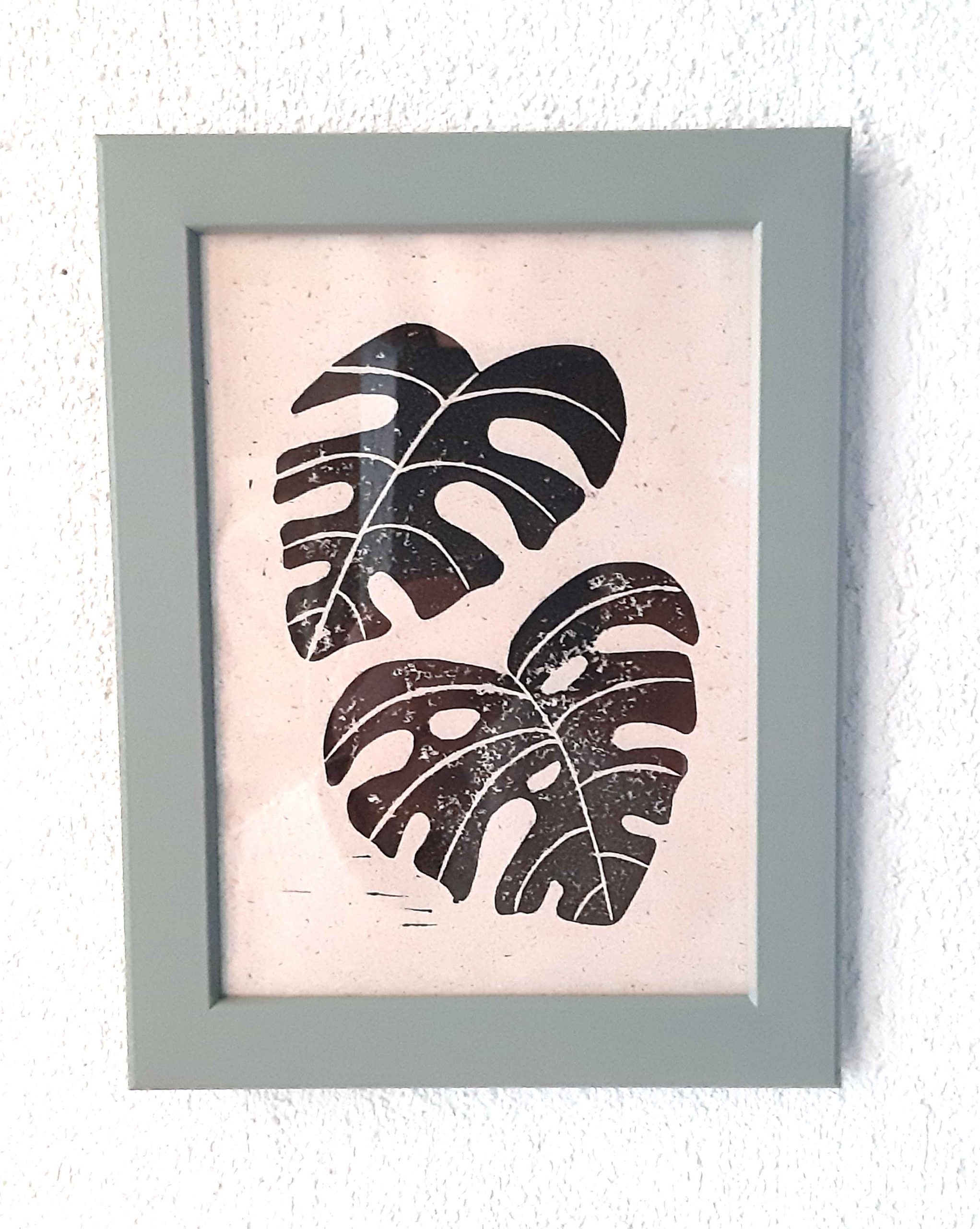 Diese gerahmte Variante des Monstera-Drucks bringt die klare Linienführung des Linolschnitts besonders schön zur Geltung. Der grüne Rahmen greift den natürlichen Charakter des Motivs auf und schafft einen feinen Kontrast zum cremefarbenen Papier.