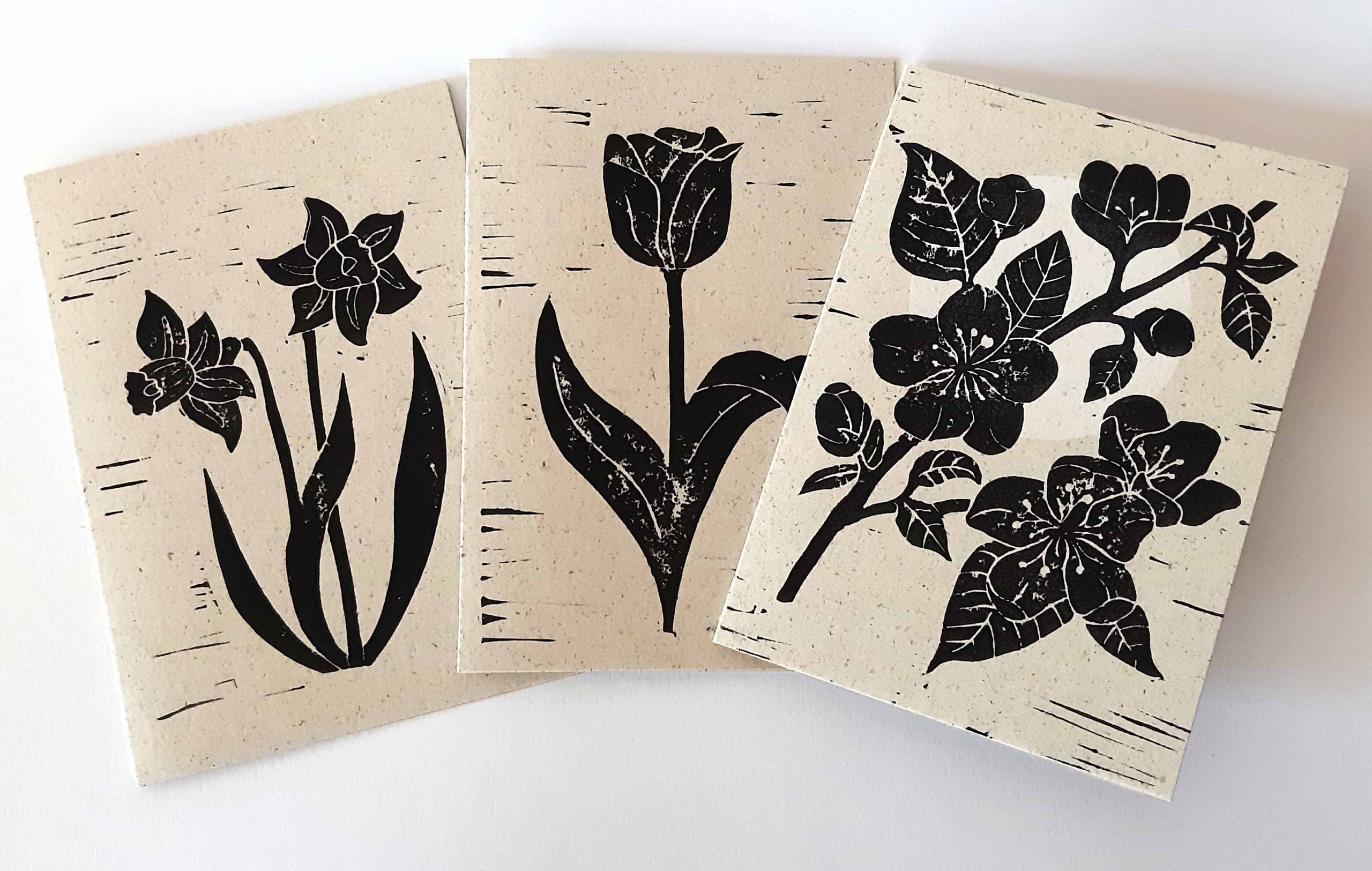 Tulpe, Narzisse & Apfelblüte – Linoldruck Grußkarten im Frühlings-Set