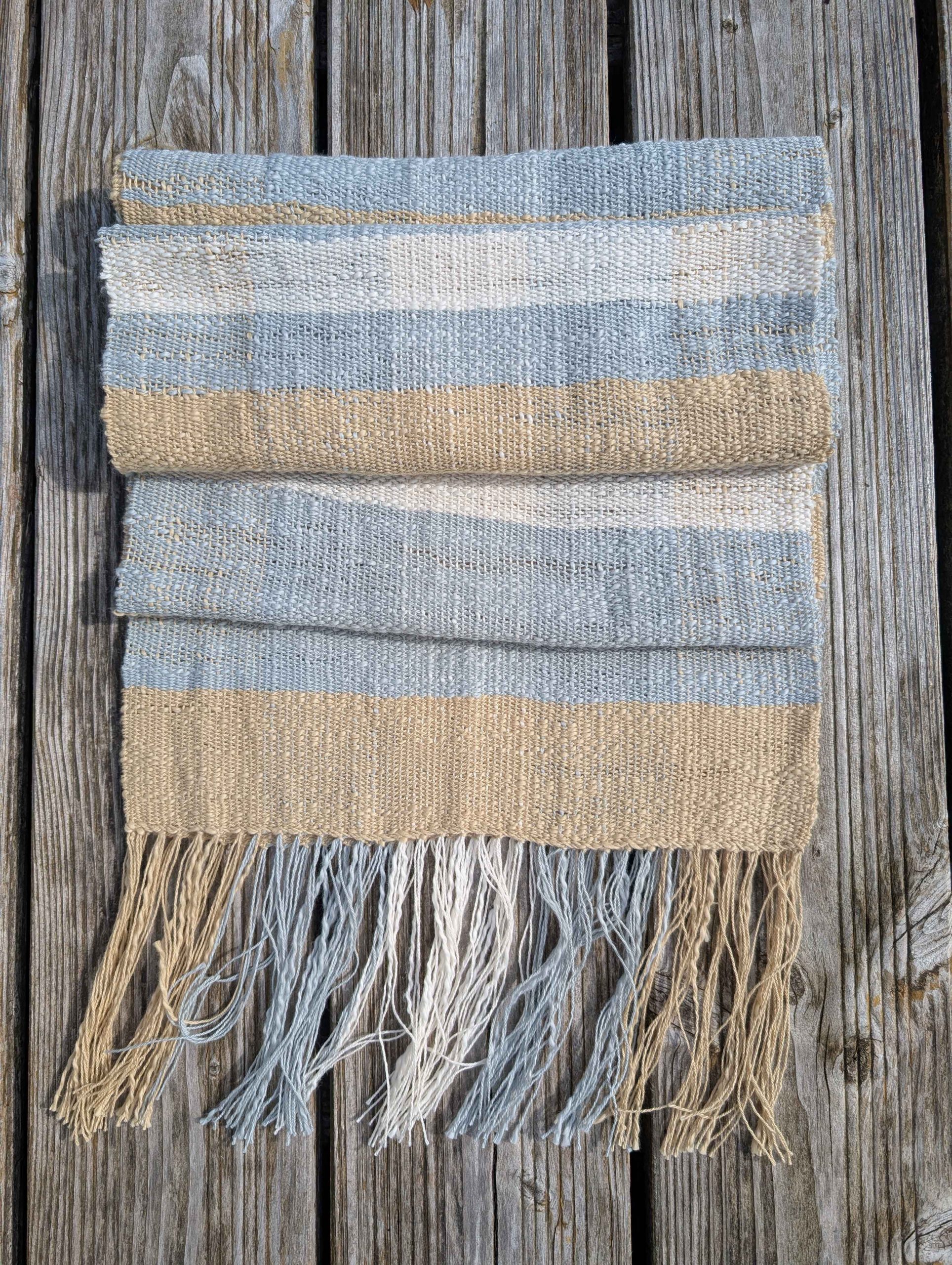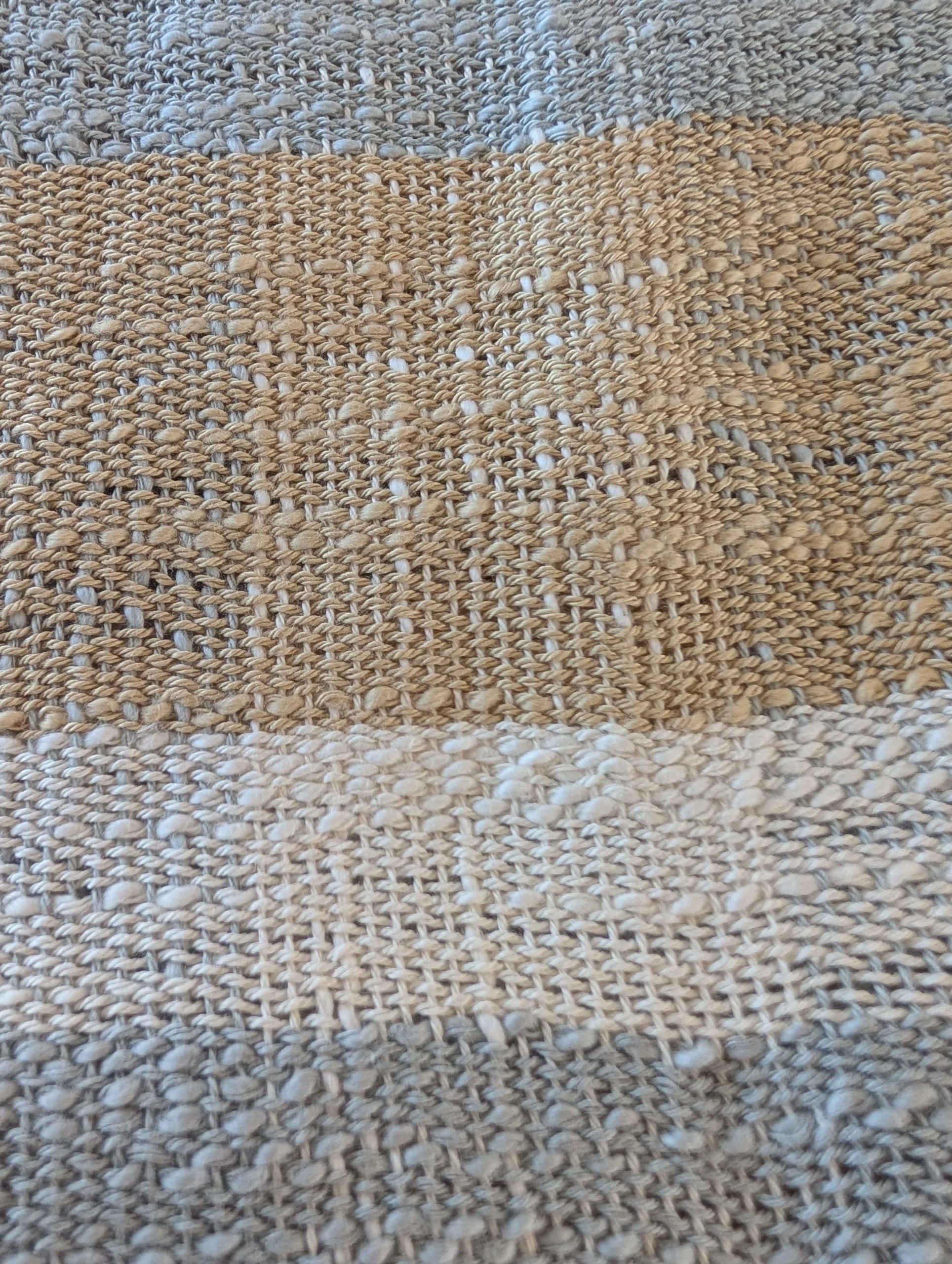 Verwendet werden drei unterschiedlich gefärbte Garne in Natur, Hellgrau und Elfenbein. Beim Weben überlagern sich diese Farben immer wieder neu und bilden ein feines, lebendiges Streifenmuster.