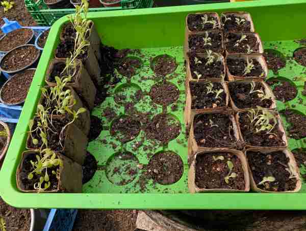 Die vorgezogenen Pflanzen durften inzwischen aus dem Haus ins Gewächshaus umziehen. Färbertagetes und Mädchenauge habe ich in größere Töpfe mit nährstoffreicher Gartenerde gesetzt, damit sie mehr Platz und ausreichend Energie für ihr weiteres Wachstum haben.