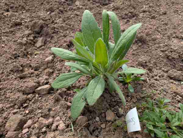 Neben den neu angelegten Flächen zeigt sich auch, was den Winter überstanden hat. Eine einzelne Pflanze des Rauen Sonnenhuts ist kräftig weitergewachsen und hat bereits jetzt einen deutlichen Vorsprung gegenüber den frisch vorgezogenen Pflanzen.