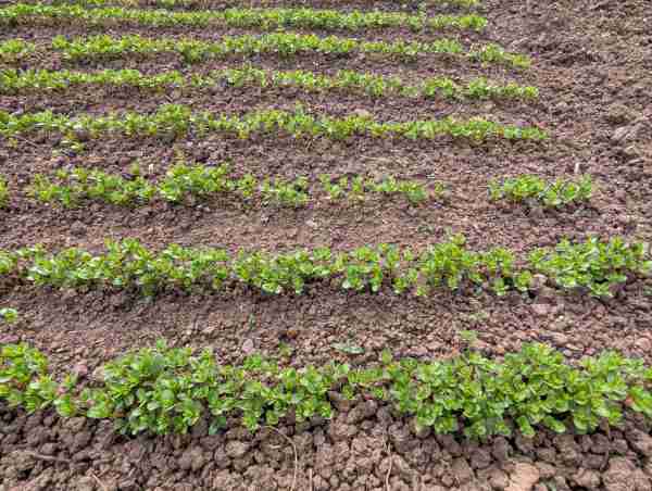 Der Flachs ist bereits eine Woche nach der Aussaat aufgegangen. Seitdem wächst er kontinuierlich weiter und bildet dichte, gleichmäßige Reihen. Im Moment zeigen beide Sorten ein sehr ähnliches Wachstum. Unterschiede sind bislang nicht zu erkennen.
