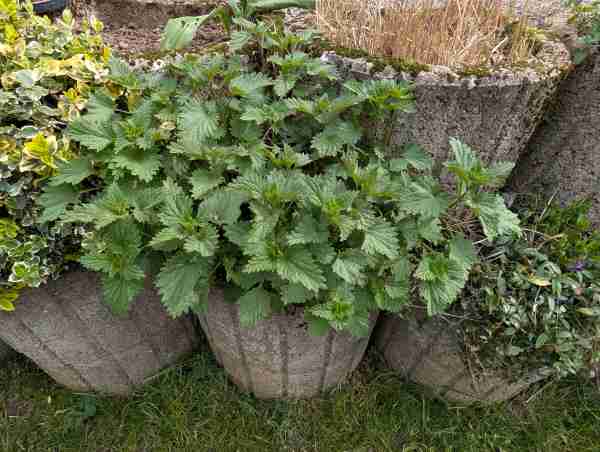 Die Brennnesseln im Kübel sind zuverlässig und kräftig wieder ausgetrieben. Sie haben inzwischen eine gute Größe erreicht, sodass sich die ersten Spitzen für ein Farbbad ernten lassen.